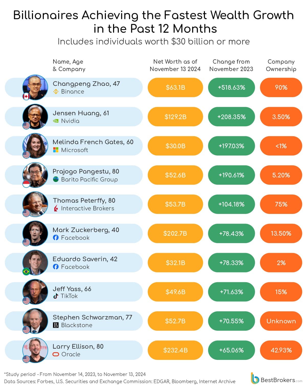 The crew at BestBrokers analysed the modifications in billionaires’ wealth from November 13, 2023, to November 13, 2024, utilizing the Forbes Actual-Time Billionaires Listing.