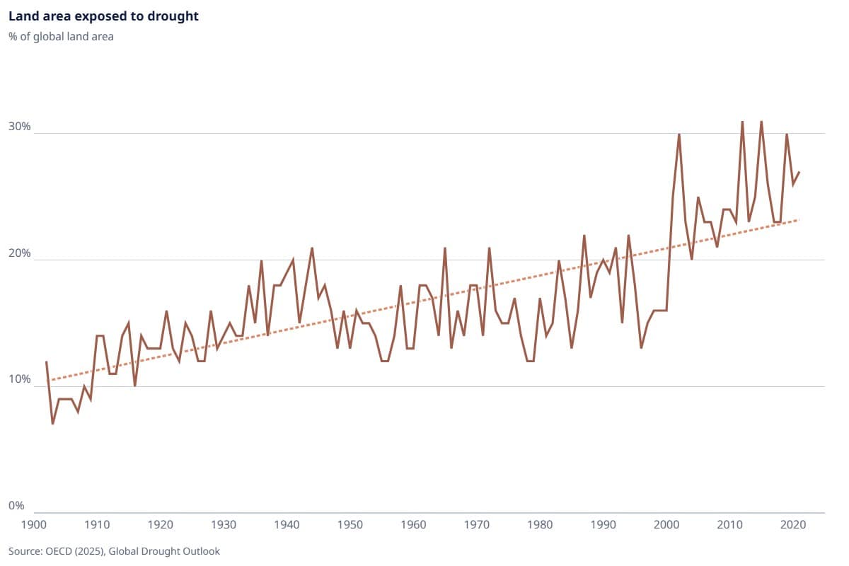 The OECD International Drought Outlook: Tendencies, Impacts and Insurance policies to Adapt to a Drier World finds that local weather change is driving the severity of droughts, with 40% of the planet having skilled extra frequent and intense droughts in latest many years.
